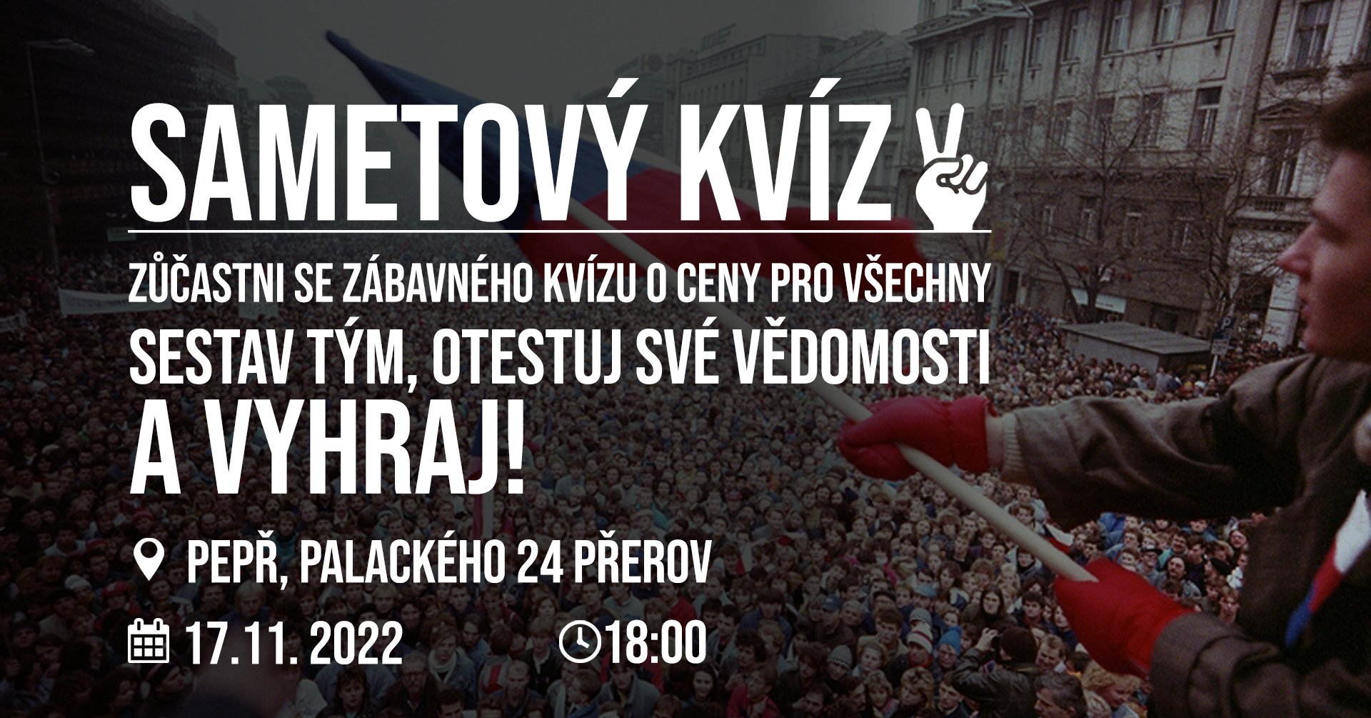 - listopad je pro Piráty nejdůležitějším svátkem. Slavíme jak Mezinárodní den studentstva, tak jako Den boje za svobodu a demokracii, kdy si připomínáme, že o svobodu se musíme každý den aktivně přičiňovat. V Přerově se sejdeme v 18:00 v PEPŘi na Palackého ulici na Sametovém kvízu.